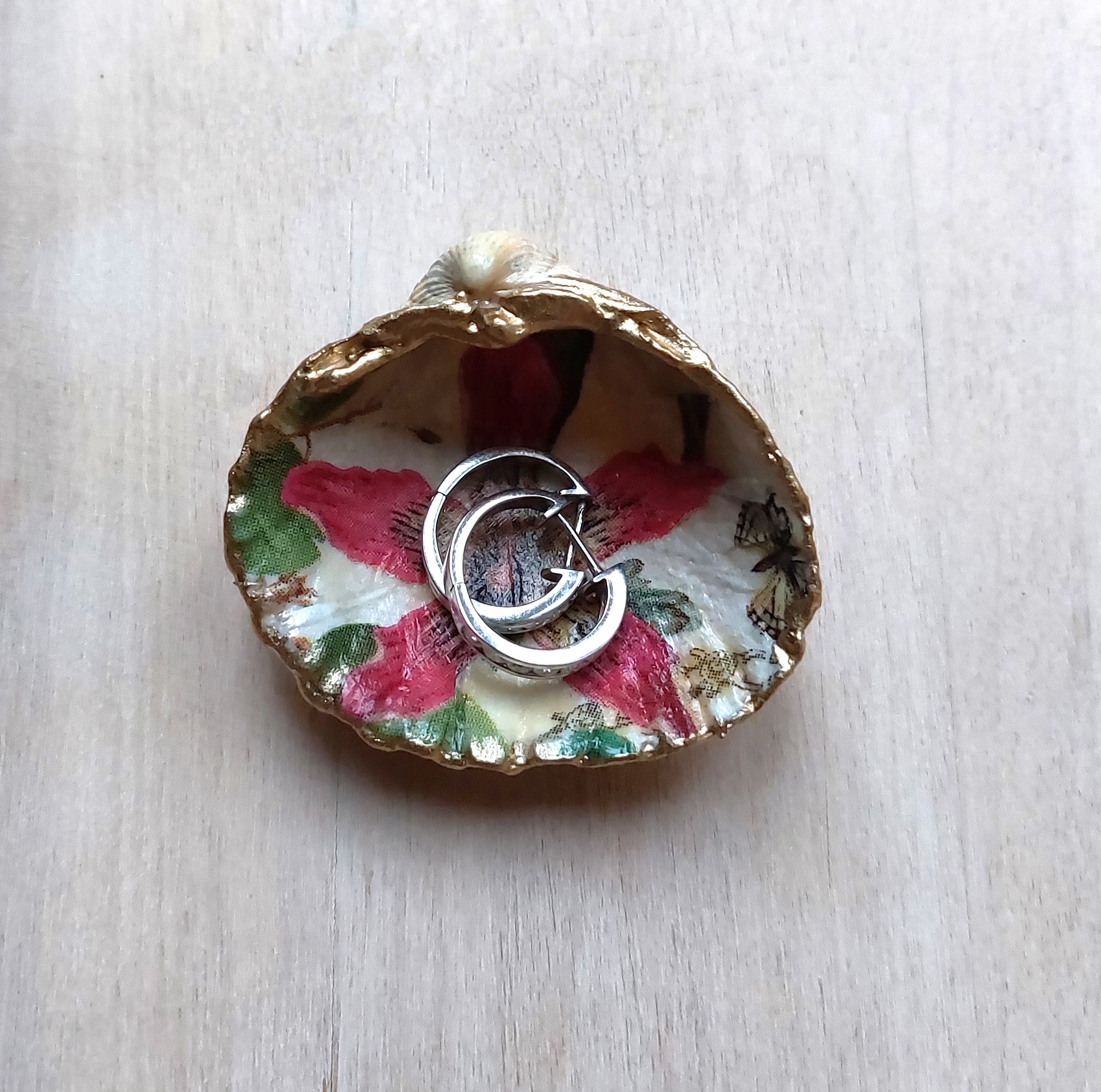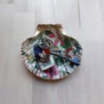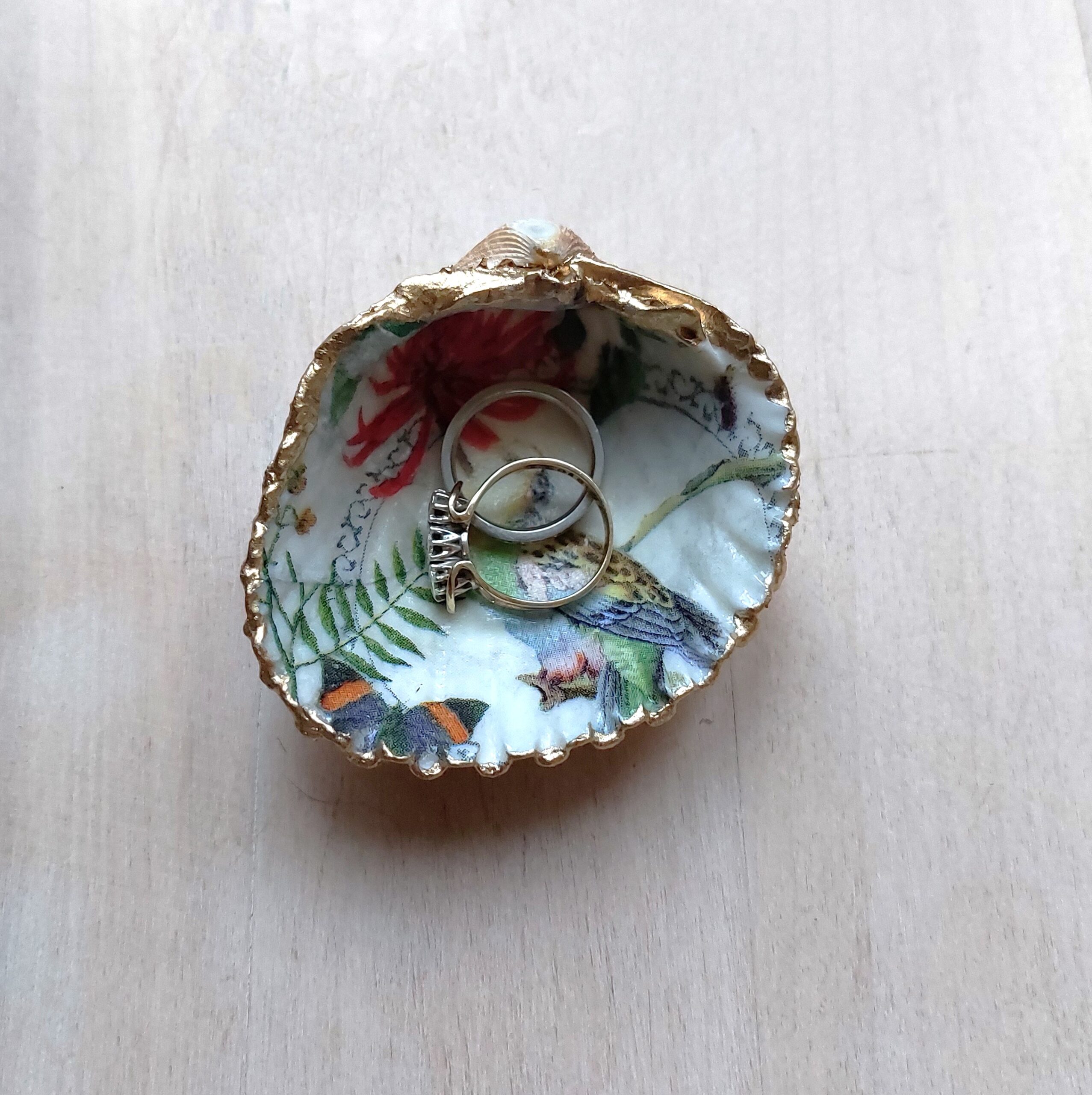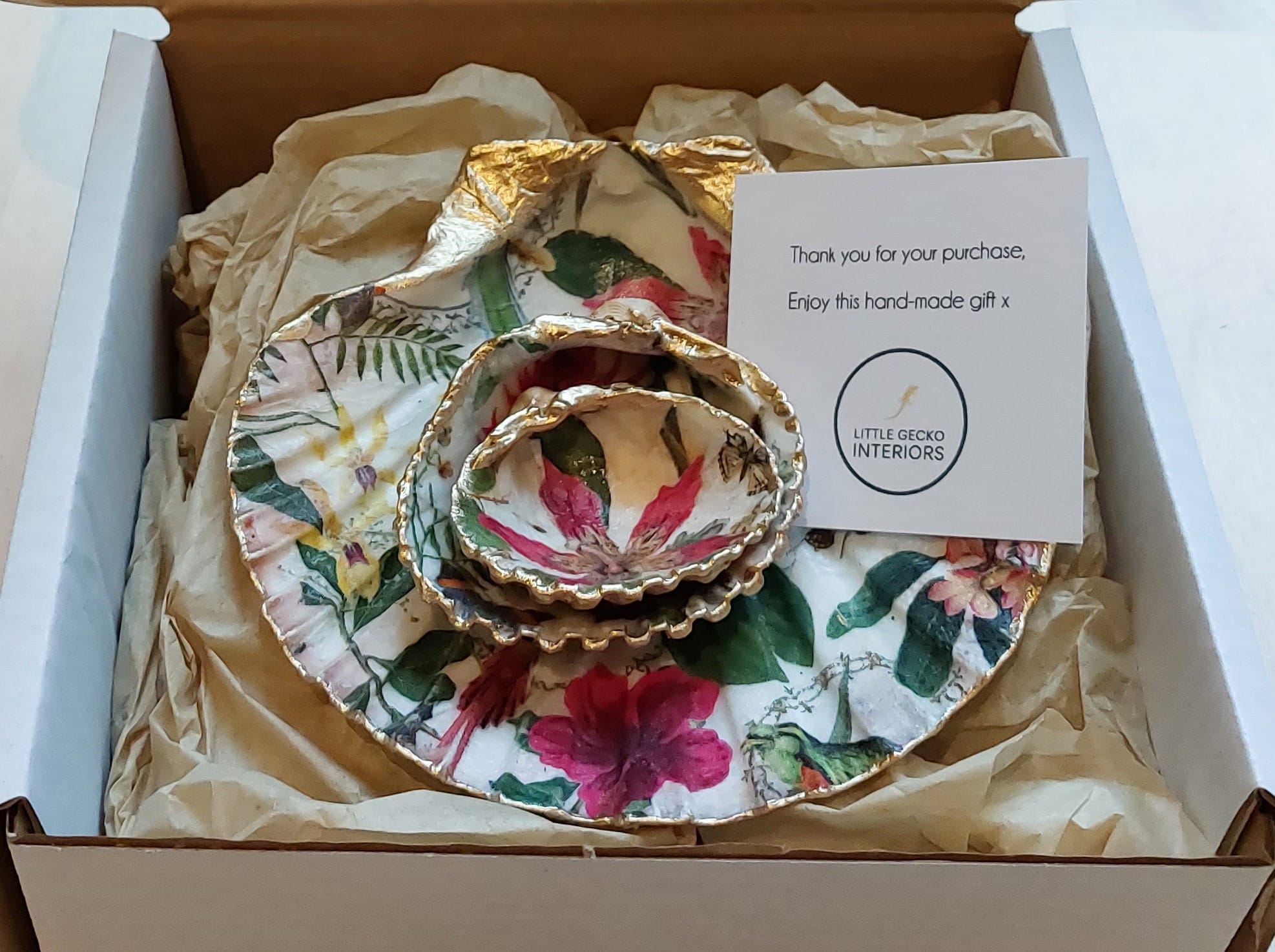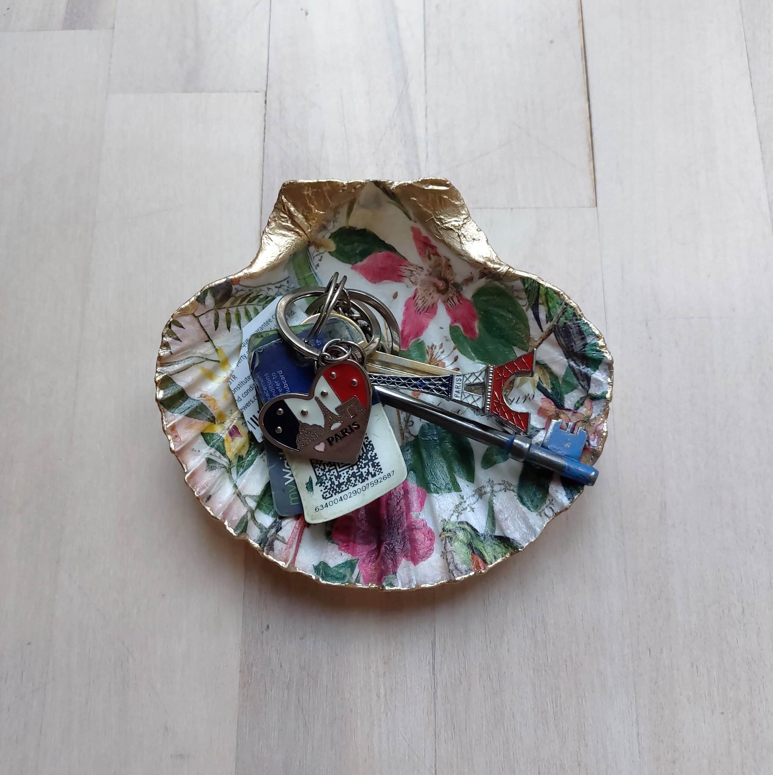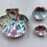 This decoupaged natural scallop shell jewellery dish in a set of three (1 large, medium and small) which has been transformed through the ancient art of decoupage into mini works of art with a vibrant pink tropical flora and fauna design that resonates with nature’s beauty.