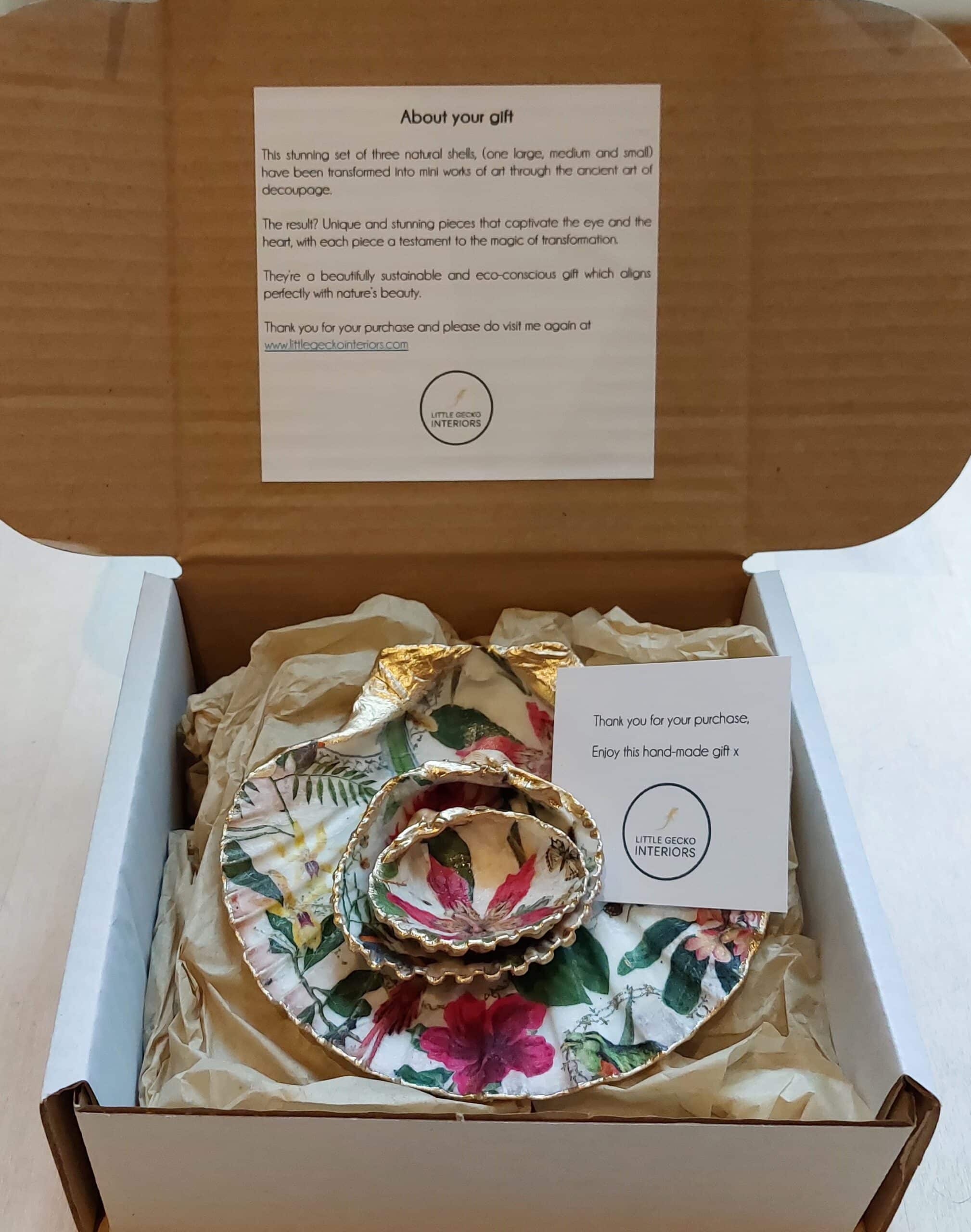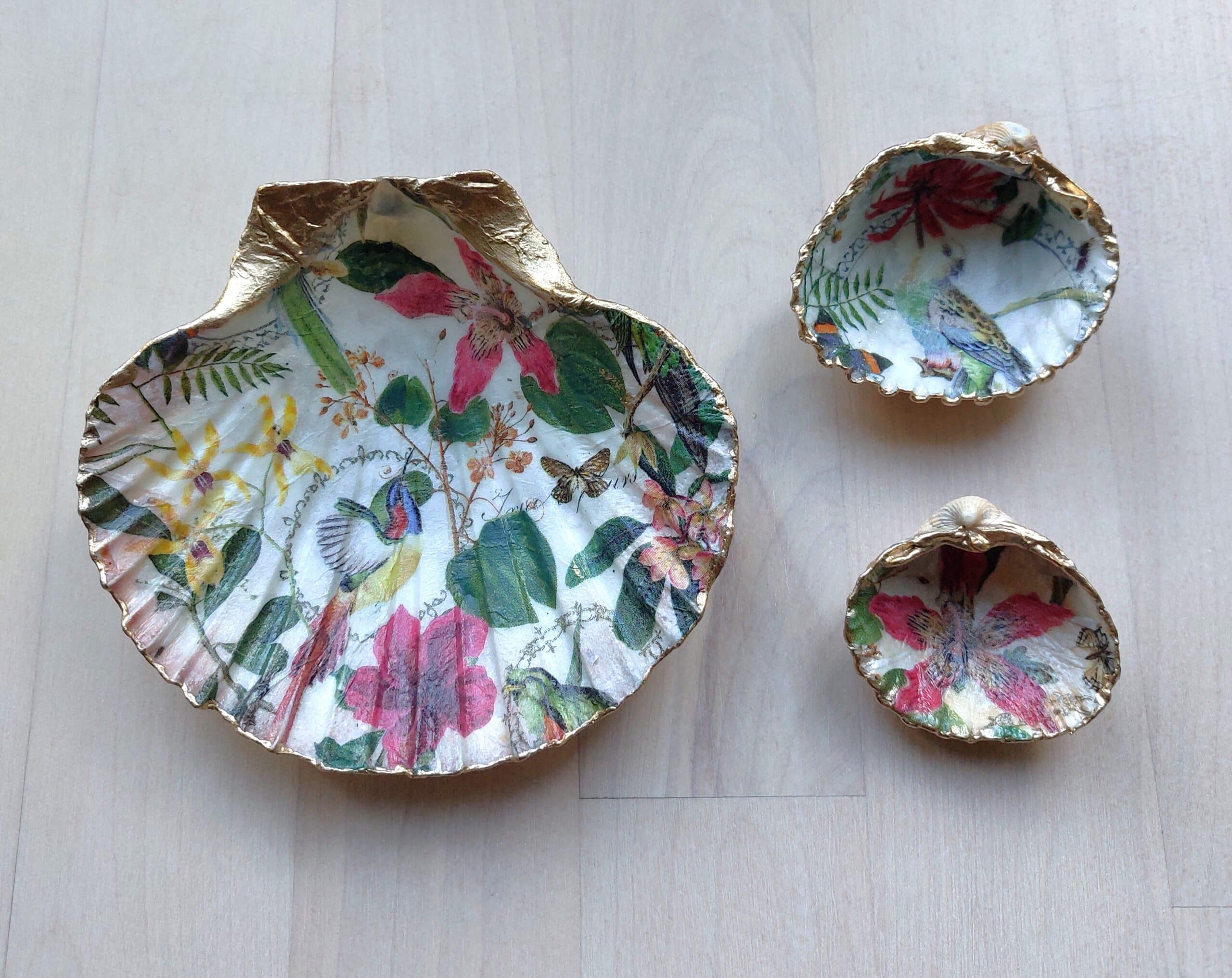 This stunning set of three natural shells, (one large, medium and small) have been transformed into mini works of art through the ancient art of decoupage.